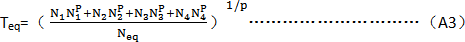 圖A1是以對數坐標的某齒輪的承載能力曲線與其整個工作壽命的載荷圖譜,圖中T1、T2、T3、……為經整理后的實測的各級載荷,N1、N2、N3、……為與T1、T2、T3、……相對應的應力循環次數。小于名義載荷T的50%的載荷(如圖中T5),認為對齒輪的疲勞損傷不起作用,故略去不計,則當量應力循環次數Neq為