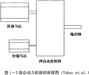 其基本原理如圖1-3所示,一個普通馬達和一個控制馬達分別驅動一個兩自由度機構的兩個輸入構件。設計者期望通過機械與馬達的恰當配合,使得普通馬達提供系統所需的主要功率,而控制馬達僅提供佼小的輔助功率,但還能夠對輸出運動進行控制。混合動力機器的研究動機之一是期望以一個大功率(大扭矩)的普通馬達、一個小功率(小扭矩)的控制馬達、以及一個機構的組合系統來替代一個大功率(大扭矩)的控制馬達,從而降低成本。混合動力機器的研究動機之二是期望利用機構具有的高機械利益(與控制馬達和負載直接耦合的清形比較而言)來提高運動控制的精度及穩(wěn)定性。