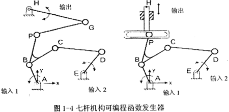 Bhartendu Seth和Sesha Sai Vaddi提出基于混合動力機器思想的可編程函數發(fā)生器(Programmable function generators),如圖l-4所示分別為七桿機構的兩種設計。