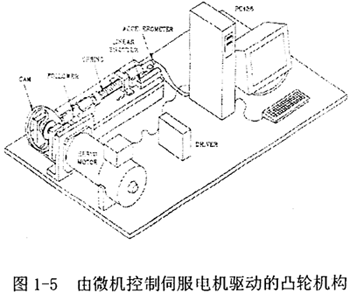 近年來,顏鴻森等人致力于有關變輸入轉速凸輪機構的研究,其具體成果為通過仿真和試驗驗證消除了從動件的運動特性曲線的不連續(xù)性,及降低了各種凸輪曲線(如擺線、多項式曲線等)的從動件和加速度峰值。其實驗系統如圖1-5所示,其中微機控制的伺服電機作為變速單元,以直動滾子從動件平面凸輪機構為執(zhí)行機構。