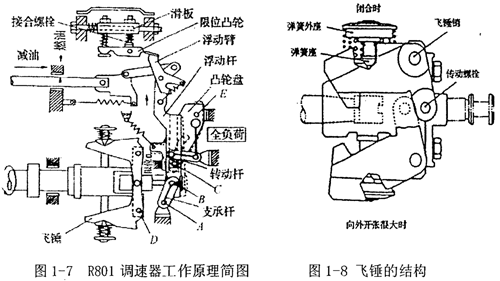 圖1-7為R801調速器的工作原理簡圖,圖1-8為飛錘結構圖。該調速器采用特殊的凸輪機構和浮動桿的可變杠桿比(1.1~5.4)進行調速,可獲得多種適應特性。在調速器上部,裝有全負荷限位機構,用于確定限位凸輪的位置。調整全負荷限位機構,將使滑板左右移動。擰出或擰進接合螺栓,可調整限位凸輪上下移動偏轉一微小角度,以此改變限位凸輪型線方程。操縱手柄和轉動桿固定在操縱手柄軸上,轉動桿帶動導向軸,導向軸的一端沿凸輪盤中滑槽的型線作運動。其另一端帶有一滑塊,滑塊在圓柱形的浮動桿內上下移動,以此實現可變杠桿比。如調節(jié)手柄轉到“怠速”位置時,浮動臂不與限位凸輪接觸,此時限位凸輪不起作用。如果發(fā)動機轉速超過設定的轉速,則飛錘更張開,使滑動螺栓左移,B點繞A點逆時針轉動,同時浮動桿繞C點按順時針方向轉動,拉引調節(jié)齒桿向“怠速”位置移動,而使發(fā)動機轉速下降。如果怠速時柴油機轉速下降,則會產生與上述相反的過程。