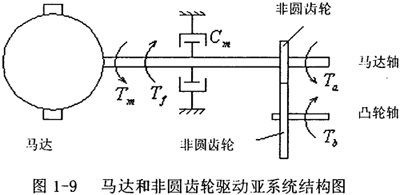 如圖1-9所示的馬達和非圓齒輪驅動系統,如果沒有加設一對非圓齒輪,馬達提供給凸輪軸的是一個恒定的速度(理論上),加了非圓齒輪后,通過非圓齒輪節(jié)線的設計,為凸輪軸傳遞一個可變的速度輸入函數,從而產生所要求的速度輸出函數。
