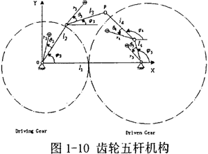 3.設計空問受約束于拓撲結構與構件的受力條件。例如,雖然四桿機構最為簡單實用,但是仍有許多性能要求更高的場合不得不采用多桿機構(如圖l-10所示的齒輪五桿機構,圖中圓齒輪分別與桿l2·l5固連)。