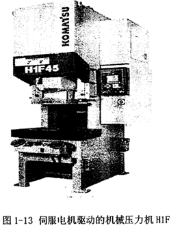 日本komatsu公司設計了一系列用伺服電機驅動的機械壓力機H1F(見圖1-13)和H2F,并已推向市場。這一設計解廖了傳統機械壓力機不能控制的問題,壓力機可根據不同的生產需要設定不同的行程長度和速度;通過伺服壓力機標配的線性光柵尺,能夠始終保證下死點的成形精度,可達到微米級,有效抑制了產品的毛刺及其他不合格品的出現;可超低速運行;模具振動小,大大提高了模具的使用壽命;但造價昂貴,能耗也大。