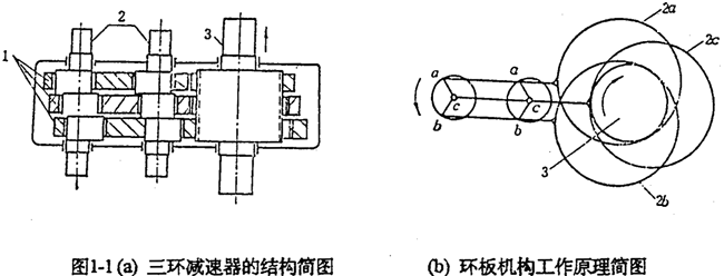 由于雙曲柄機(jī)構(gòu)在曲柄旋轉(zhuǎn)一周要經(jīng)過對稱的兩個(gè)“死點(diǎn)”位置,可以采用兩相(套)以上的并列雙曲柄機(jī)構(gòu)以克服“死點(diǎn)”的不確定性。如三環(huán)減速器(見圖1-1),它是由相位差互為120°的三套平行雙曲柄機(jī)構(gòu)組成的三相并列雙曲柄機(jī)構(gòu)。當(dāng)某一套雙曲柄機(jī)構(gòu)位于“死點(diǎn)”位置時(shí),另兩套雙曲柄機(jī)構(gòu)通過支承高速軸傳遞扭矩推動其越過“死點(diǎn)”位置。這種結(jié)構(gòu)的缺點(diǎn)是軸向尺寸大,中間齒板安裝比較困難,必須采用偏心套形式。高速軸上的鍵槽分度精度要求高。另外,三片行星齒輪,運(yùn)轉(zhuǎn)過程中容易出現(xiàn)載荷分配不均的現(xiàn)象。采用這種原理克服“死點(diǎn)”的連桿行星齒輪傳動還有單齒環(huán)(見圖1-3)等減速器。
