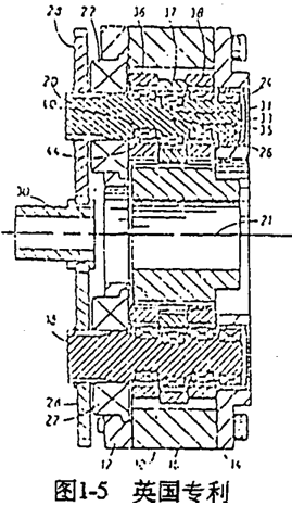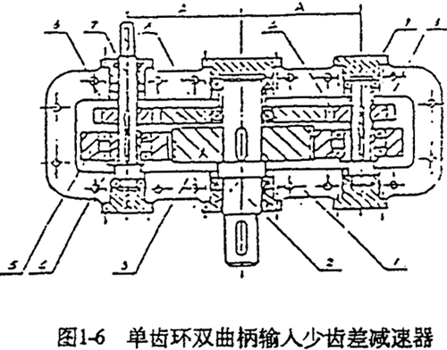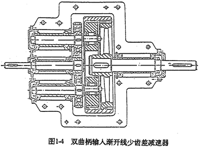 雙曲柄機(jī)構(gòu)中,如果在兩根曲軸上都有動力輸入,則“死點(diǎn)”位置也就自然不存在了。因此,可以通過一套定軸傳動機(jī)構(gòu)把動力從一輸入高速軸傳遞到另一高速軸,從而克服機(jī)構(gòu)“死點(diǎn)”。根據(jù)這種原理制成的雙曲柄輸入少齒差行星齒輪裝置之不理的類型很多,如太原工學(xué)院五十年代研制的雙曲柄輸入漸開線少齒差減速器(見圖1-4)、英國專利(見圖1-5)、、重慶鋼鐵公司研制的單齒環(huán)雙曲柄輸入少齒差減速器(見圖1-6)、日本松本和幸等人研制的RV減速器(見圖1-7)。其特點(diǎn)都是通過外嚙合齒輪副將輸入動力分流、傳遞到多個(gè)曲柄軸上,形式多軸輸入,從而克服“死點(diǎn)”。這種結(jié)構(gòu)的特點(diǎn)是其傳動比為定軸傳動的傳動比與少齒差行星齒輪傳動的傳動比之乘積,因而可以通過改變外嚙合齒輪的齒數(shù)方便函地滿足不同傳動比的要求,適應(yīng)性強(qiáng)。其不足之處是結(jié)構(gòu)復(fù)雜,而且在高速軸之間存在兩平行傳動的剛性傳動鏈(外齒輪嚙合副和雙曲柄機(jī)構(gòu))對誤差比較敏感,加工精度要求很高。