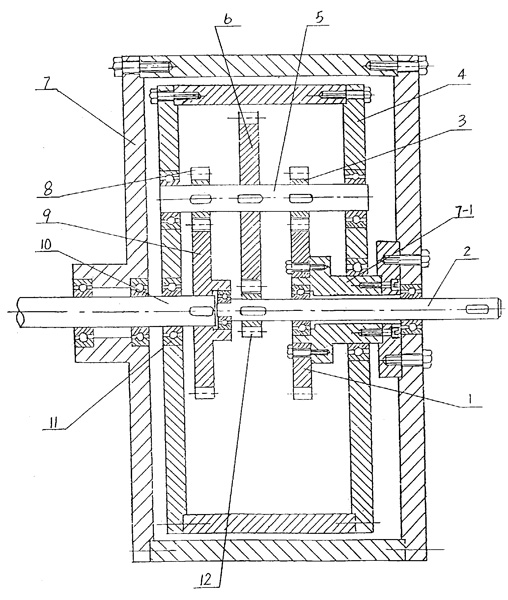 | 一種外齒式差動減速機(jī),包括大箱體(7)、軸承(11)、支承在大箱體(7)上的輸入軸(2)和輸出軸(10),其特征在于: a、輸入軸(2)上固定連接有主動齒輪(12); b、輸出軸(10)的內(nèi)端固定有輸出齒輪(9); c、大箱體(7)內(nèi)具有可旋轉(zhuǎn)地支承在大箱體(7)和輸出軸(10)上的行星齒輪架(4),大箱體(7)內(nèi)還有與大箱體(7)固定連接的速比定齒輪(1); d、行星齒輪架(4)上支承有行星齒輪軸(5),該行星齒輪軸(5)上固定連接有與主動齒輪(12)嚙合的傳動齒輪(6)、與速比定齒輪(1)嚙合的第一行星齒輪(3)和與輸出齒輪(9)嚙合的第二行星齒輪(8)。 |