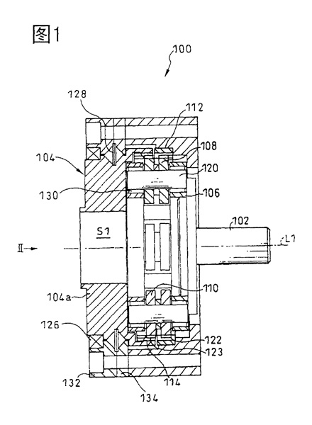 一種減速機,其備有:輸入軸、將該輸入軸的旋轉減速的減速機構部,以及將利用該減速機構部減速的旋轉輸出到相應機械側的輸出軸,其特征為, 在將前述輸出軸制成中空的同時,將前述輸入軸和輸出軸分別同軸地配置,利用配備有連接到前述輸入軸上的托架,以相同的旋轉速度可旋轉地支承在該托架上的第一、第二行星齒輪,與前述第一行星齒輪嚙合、并保持固定狀態的第一內齒齒輪,與前述第二行星齒輪嚙合、并連接到前述輸出軸上的第二內齒齒輪的行星齒輪機構構成前述減速機構部,并且, 在前述第一、第二行星齒輪中,至少將一個行星齒輪的齒形制成次擺線的齒形,同時,將與該次擺線齒形的行星齒輪嚙合的齒輪制成圓弧齒形。