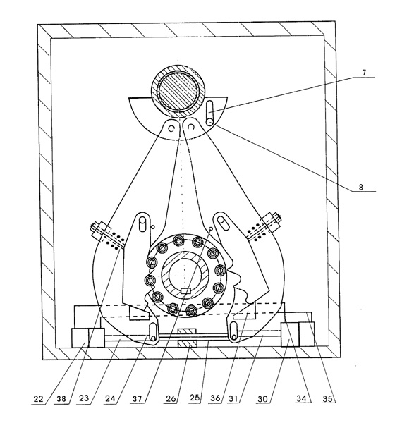 一種減速機,其特征是輸入軸是偏心軸(2),偏心軸(2)中間偏心外圓上設置3-12個外套(32),每個外套(32)上分別連接連桿(27)位于殼體(1)內一側,每個連桿(27)連接能與滾輪(13)邊緣上的滾子輪(10)嚙合的鉤齒板(16);在工作時至少有1個鉤齒板(16)和對應滾輪(13)邊緣上的滾子輪(10)嚙合,每個滾輪(13)邊緣上裝有5-80個滾子輪(10),上述所述的連桿(27)上裝有與滾輪(13)邊緣上的滾子輪(10)嚙合的鉤齒板(16)與對應的3-12個滾輪(13)分別固定在輸出軸(12)上,且兩個相鄰滾輪邊緣上的滾子輪(10)在橫向排列上相位差是一個等值弧度,在連桿(27)上設置有定位槽(24),固定銷(21)設置在連桿(27)定位槽(24)內位于殼體(1)內,鉤齒板(16)背面設置有彈性復位裝置。