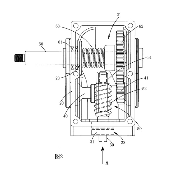 一種減速機,主要包括一本體、一動力軸、一帶動軸、一蝸桿組及一傳動軸,其特征在于: 所述本體,向外開設有一動力輸入口及一動力輸出口,且動力輸入口的方向垂直于動力輸出口; 所述動力軸,一端與預設動力源相接,且動力軸另一端通過動力輸入口樞穿于本體內; 所述帶動軸,樞架于本體內,于所述帶動軸上裝設有一小齒輪; 所述蝸桿組,包括一環齒蝸輪及一蝸桿,且蝸桿組同樣位于本體內,所述環齒蝸輪同軸固設于帶動軸,而蝸桿則同軸固設于動力軸端部,藉由蝸桿偏位嚙合于環齒蝸輪; 所述傳動軸,一端與預設被帶動件相接,且傳動軸另一端通過動力輸出口樞穿于本體內。