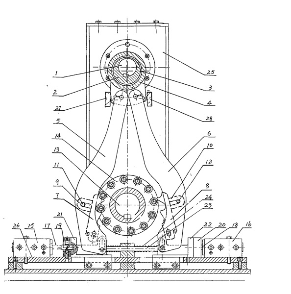 一種換向減速機包括殼體,換向裝置,主動輪,被動輪,輸出軸,輸入軸,其特征在上述所述的輸入軸(1)上固定偏心輪(2),偏心輪(2)外圓上有偏心軸承(3),偏心輪軸承(3)外圓上有拉板套(4),拉板套(4)上分別鉸連左拉板(5)、右拉板(6);左拉板(5)上鉸連左拉鉤(7),左拉鉤(7)上固定左拉鉤導塊(9);用左拉鉤導塊銷(11)與左拉板(5)鉸連;在右拉板(6)上鉸連右拉鉤(8),右拉鉤(8)上固定右拉鉤導塊(10)用右拉鉤導塊銷(12)與右拉板(6)鉸連,在輸出軸(13)上固定套筒滾子輪(14),在底板(26)上固定左程控液力缸(15)、右程控液力缸(16),左拉板導板(21),右拉板導板(22);在左程控液力缸(15)內裝左柱塞(17),用左拉板鎖定器(19)與左拉板導板(21)連接,在右程控液力缸(16)內裝有右柱塞(18),用右拉板鎖定器(20)與右拉板導板(22)連接,解鎖彈簧(24)套在推桿(23)上,拉板套(4)兩側設置有左限位板(27),右限位板(28)。