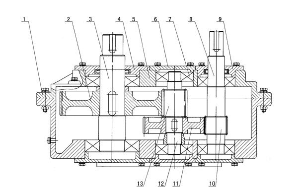 齒輪減速機,減速機設備領域。包括箱體和活動支撐在箱體上的主傳動軸、中間傳動軸以及被動傳動軸,箱體通過螺栓固定連接端蓋,主傳動軸上安裝一主齒輪,中間傳動軸上安裝一被齒輪和二主齒輪,被動傳動軸上安裝二被齒輪,一主齒輪與一被齒輪相嚙合,二主齒輪與二被齒輪相嚙合,其特征在于:一主齒輪(10)與一被齒輪(11)的模數為2,二主齒輪(13)與二被齒輪(2)為模數3.5的雙圓弧齒。與現有技術相比具有體積小、噪音低、傳動效率高,節約原材料和能源等優點。