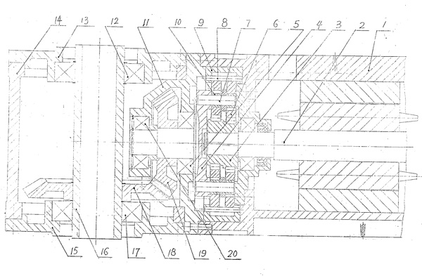 一種直角式減速機,其特征在于由電機直聯式擺線減速機及錐齒輪兩級減速構成,其中擺線減速機由機座[1]、輸入軸[2]、偏心軸承[3]、輸出軸[4]、擺線輪[6]、柱銷[7]、柱套[10]、針齒銷[8]、針齒殼[9]、端蓋[11]組成,輸出軸由軸承[5]與[20]支承在端蓋內孔中,主動錐齒輪[19]裝在輸出軸[4]的前端,從動錐齒輪[18]與軸[16]聯接一體,軸的兩端分別用軸承[12]、[17]支承在與箱體兩端聯接的端蓋[13]與[15]上,軸[16]可以是實軸,亦可以是空心軸,亦可以是帶法蘭的軸;