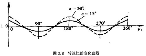 (3)當轉子軸線之間存在偏角位移時(如圖3.6),從動轉子的角速度與主動轉子角速度是不同的,從動轉子的角速度為