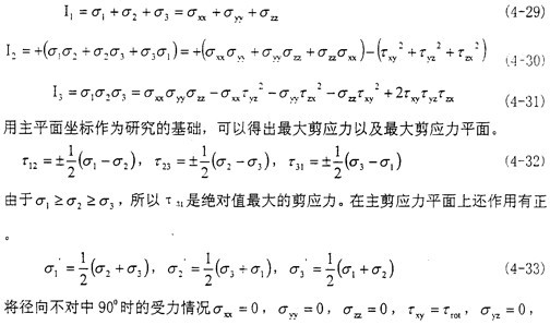 該方程有三個(gè)實(shí)根,分別為σ1,σ2,σ3,且有σ1≥σ2≥σ3,此三個(gè)應(yīng)力即為分別作用于三個(gè)相互垂直平面上的主應(yīng)力值,并且在此三個(gè)平面上無(wú)剪切應(yīng)力。當(dāng)坐標(biāo)變換時(shí),雖然每個(gè)應(yīng)力分量都隨之改變,但是有些量是不變的,Il,I2,I3分別為第一,第二,第三應(yīng)力不變量。