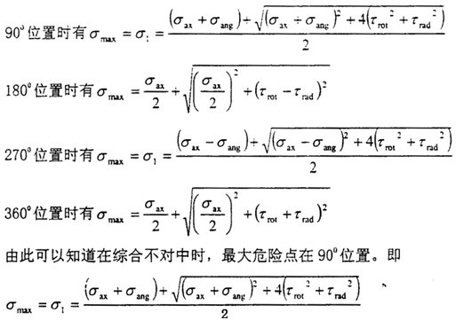 此時(shí)的應(yīng)力情況屬于三向應(yīng)力狀態(tài),所以其分析過(guò)程和徑向不對(duì)中900以及2700情況相似,只是這里還有了附加的軸向拉應(yīng)力和附加的角向應(yīng)力,將各個(gè)應(yīng)力值
