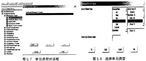 考慮到分析橡膠材料所能用到的單元,選擇Main Menu>Preprocessor>Element type>Add/Edit/Delete,在出現的對話框中,單擊“Add”,如圖5.7所示。這時又出現一個“Library of Element Type”對話框,在左面的列表欄中選擇“Structural Solid”,在其右面的列表欄中選擇“2Onode186”,單擊0K按鈕,如圖5.8。再在單元對話框中單擊Close按鈕關閉對話框。