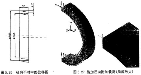 軸向不對中時,根據實際情況取中量為△ax=5mm,則可以認為外端面沿z軸方向的位移為5mm,如圖5.18所示。產生的附加的軸向載荷按照。選擇選擇Main Menu>>Solution>Define Loads>Apply>Structural>Force>Moment>On Nodes命令,選擇圓環外端面上所有的節點,在出現的對話框中選擇比,并在輸入value文本框中輸入39。加載后的結果如5.19所示。旁邊為局部放大圖。
