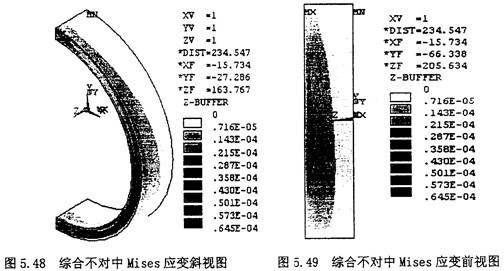 3.顯示節點的Von Mises應變云圖:選擇Main Menu>General Postproc>Plot Result>NodalSolu,在彈出的對話框內選擇“Strain”,第二欄內選擇“Von Mises Strain”,則其顯示的云圖如圖5.48,5.49所示