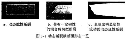 在管道用鋼韌性性能大幅度上升的背景下,20世紀60年代,延性失穩斷裂事故首次在輸氣管線上出現。動態延性斷裂(DDF)在宏觀剪切面上擴展,與管道表面呈45度傾斜角,有很大的剪切唇,如圖3-lb和圖3-1c所示。雖然這種斷裂的環境溫度高于鋼材的韌脆轉化溫度,但由于鋼材的韌性相對于強度較低,還是使動態斷裂擴展先于顯著的塑性應變而發生。