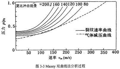 雙曲線法的具體分析過程如圖3-3所示,坐標橫軸表示速度,縱軸表示氣體壓力或環向應力。上方的一組曲線表征不同韌性水平下的斷裂速度,是內壓或環向應力的函數。隨著內壓或環向應力在斷裂過程中的減小,斷裂速度不斷降低。如果壓力或應力足夠低,斷裂速度即減小到零而發生止裂。