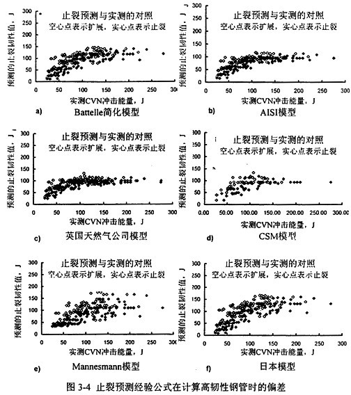 圖3-4表示了Battelle應用Maxey雙曲線法對全尺寸實驗數據庫所做的DDF止裂韌性預測,圖3-4a至圖3-4f分別對應于式(3-3)至式(3-8)。圖中顯示的實驗用管的鋼級包括X52到Xl00,管徑范圍從4O6mm到1422mm,實驗最高壓力超過16MPa。可見,預測模型在管材韌性低于某一水平時預測結果與實物實驗結果基本吻合,但當管材韌性較高時出現明顯偏差,預測應該止裂的管線沒有止裂。經典的止裂預測模型在預測夏比能量值高于94J的管材時,已經偏于危險,即過高估計了管材的止裂性能。