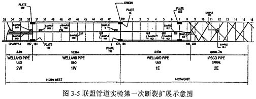 為了驗證聯盟管道Φ914和Φ1067鋼管的止裂韌性,進行了兩組全尺寸瀑破實驗,實驗管段全長約366m,中間為9根11m長的實驗樣管,爆破實驗時裂紋將在其中進行擴展。實驗樣管沿東西方向分別標為1E、2E以及1W、2W等,預制裂紋穿過1E和1W之間的環焊縫。第一次實驗的示意圖如圖3-5所示。
