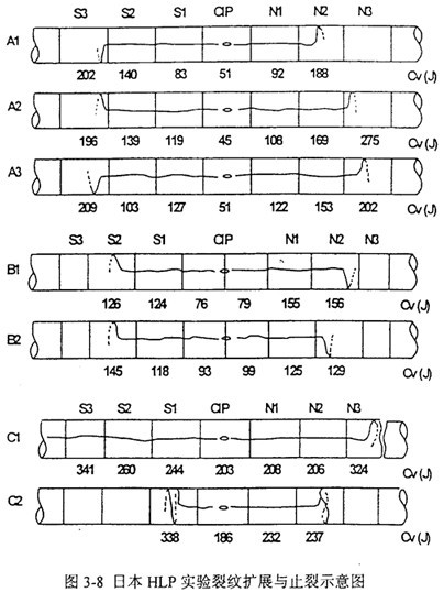 A系列實驗中,裂紋沿夏比沖擊能量CKV值約為50J的起裂管CIP,依次穿過韌性值遞增排列的鋼管。各管段的大致韌性值是在每次爆破實驗后經過精心研究確定的。A3中Sl到S2是唯一的例外;