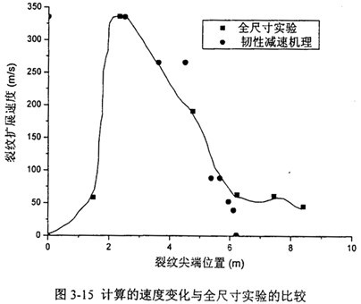 本文通過上述方法,對圖3-9至圖3-12中的全尺寸實測斷裂速度曲線結果進行了校核,得到了比較吻合的結果。現以聯盟管道第一次實驗IE段為例,設定擴展的初速度為330m/s,速度變化的計算值同實驗對比如圖3-15所示: