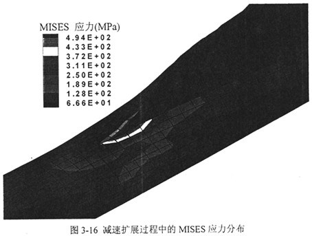根據圖3-16中的MISES應力分布可以判斷裂尖處的塑性區范圍。隨著裂紋擴展過程中韌性導致的速度降低,塑性區的范圍逐漸縮小。