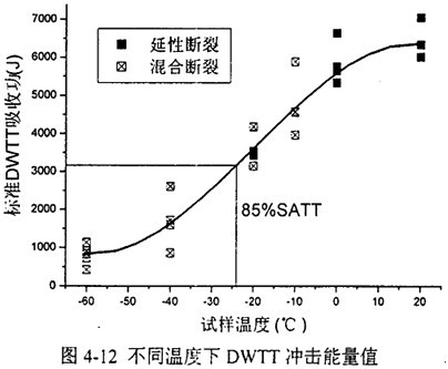 表4-4給出了這些DWTT實驗的特征值和85%剪切面積對應的轉變溫度。