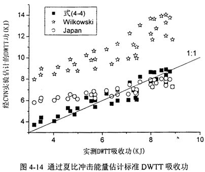 圖4-14將(4.2)~(4.4)式預測的對應關系同真實實驗結果做了對比。可以看到對于相近的CVN韌性預測結果,實際的DWTT功從低到高在大范圍內分布。
