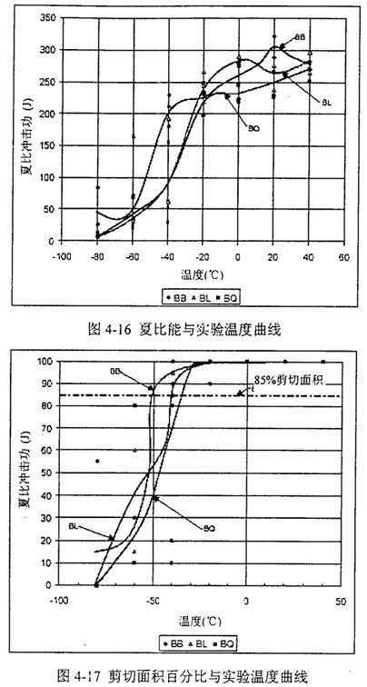 表4-3給出了歸納的夏比沖擊能量值及85%剪切面積對應的轉變溫度。