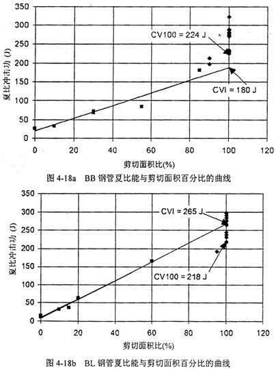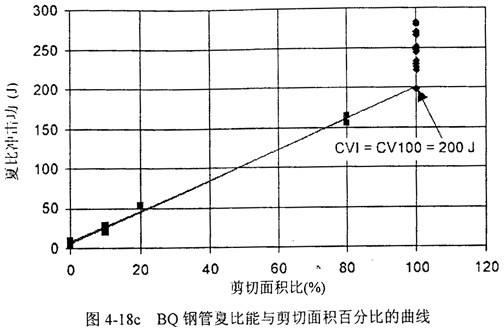 圖4-18a,b,c給出了三家鋼管的夏比能與剪切面積的關系,以及85%剪切面積對應的轉變溫度。圖中CV100表示100%剪切面積時最低的夏比能,CVI表示最低夏比平臺能,也稱夏比轉變能,CVP表示夏比平臺能。菱形實驗點表示剪切面積高于90%,方形實驗點表示低于90%可以看到,剪切面積低于90%時,夏比能與剪切面積呈線性關系。
