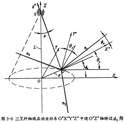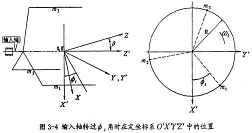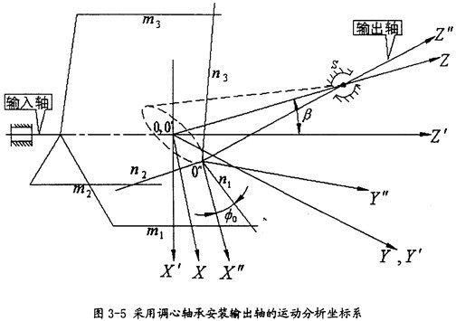 由于輸出軸作一圓錐運動,在分析的過程中需建立三套坐標系,如圖3-5所示。