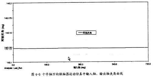 選取合適的步長,在缺省模式下(由前面的自上度為0,可知此時的仿真是運動仿真)對模型做仿真分析,并在結果中輸出兩軸夾角的測量值曲線圖(如圖4-6所示)以及輸入、輸出軸角速度測量的曲線圖(如圖4-7所示)。