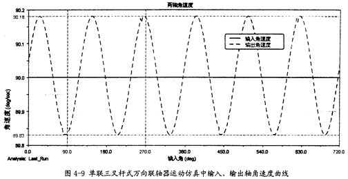 由圖4-9可以知道,當輸入軸轉速恒定為90o/s時,輸出軸并不作恒速轉動,而是以90o/s為中心,作非常有規律的周期性運動,在每一個回轉周期中,它的變化頻率為3次。這里的結果同第三章中的曲線圖3-8也是完全吻合的,因此在一定的程度上也證明了三叉桿萬向聯軸器轉速分析理論的正確性。
