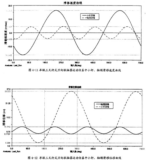 由圖4-11可以知道,在一定的夾角下,小桿在滑道中的滑移速度同小桿球面中心相對軸頸的滑移速度是不同的,前者要遠大于后者,且它們變動的頻率也不一樣,在一個回轉周期中,前者頻率是1次,而后者是2次。此圖中的兩曲線同第三章中的理論分析曲線圖3-11、圖3-12是吻合的,只是小桿滑移的速度曲線在外形上有一點差異,仿真的曲線相當的平滑、規則,但理論分析曲線卻不規則,這可能是在計算中簡化和省略的原因。盡管如此,這也證明了三叉桿式萬向聯軸器理論分析中對小桿滑移速度和軸頸滑移速度這兩項計算的正確性。