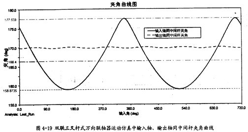 由圖4-19可以看出,雙聯三叉桿式萬向聯軸器在轉動的過程中,中間桿同輸入軸、輸出軸之間的夾角都在變化,且兩個夾角的變化的大小相差很大,一個較為平滑(β=10°),而另-個則以較大的幅度(18°)呈周期變化,在每-個回轉周期中,它的變化頻率為l次。
