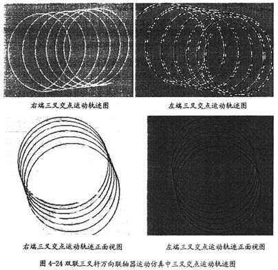 由圖4-24可以看出,雙聯三叉桿式萬向聯軸器在運轉的過程中,雙聯三叉桿的左右兩端三叉交點的運動軌跡都呈螺旋線變化,且非常有規律,它們的正面視圖均為標準的圓,這一種特性有別于單聯的三叉桿式萬向聯軸器的特性。這種情況的出現主要是由于中間桿在轉動的過程中是一種準圓錐擺運動(由于中間桿同輸入軸及輸出軸夾角變化不一樣,如圖4-19所示),而且因為系統的自由度不為0,系統實際進行的是動力仿真,于是產生了同中間桿軸線不垂直的離心力,這樣在中間桿的軸向上就會有分量,在此分力的作用下必定會出現中間桿向一端的運動。(因為中間桿在軸向上可以自由運動,故在實際的應用中,如果重力在中間桿的軸向上有分量,那么中間桿也會移向一端。這樣的情況并不是我們所想要的,所以要想在實際中應用雙聯的三叉桿式萬向聯軸器就必須對這種結構進行改進。)
