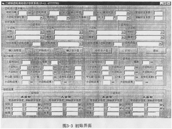 c、輪齒疲勞強度及其修正系數(ZNT、YNT、ZL、Zv、ZR、Zx、Yx、Yδreit、YRreIT)在這三類參數中,用戶參數是要由用戶給定,齒輪特性參數是要得到的結果,齒輪設計參數是一種中間描述參數,它需要通過一系列的復雜的計算求解,而齒輪設計的科學性也就是通過對齒輪設計參數的精確確定而實現的,具體計算機實現公式見3.6-3.8;齒輪的接觸強度與彎曲強度校核分別見3.3和3.4。系統的參數初始輸入界面見圖3-3。
