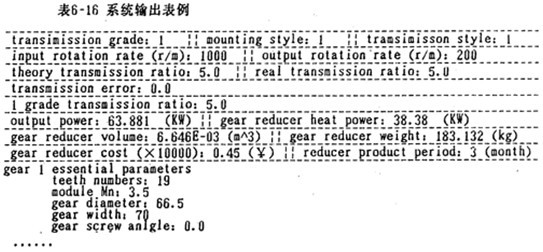 圓柱齒輪減速器設計完成后,其結果為一系列表(LISP 語言形式)組成的結果。為了使專家系統的結果方便地被用戶所理解,系統設置有相應的輸出函數,并以表格的形式,輸出所需的設計數據。下表(表6-16 )為專家系統設計的一一級圓柱齒輪減速器的示例。