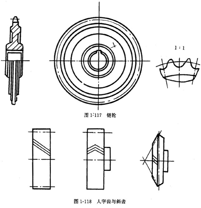 ⑤當需要表示齒線的形狀時,可用三條與齒線方向一致的細實線表示(圖1-116、1-118)。直齒則不需表示。
