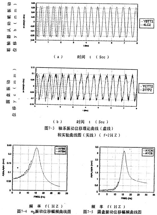 測量數(shù)據(jù)進(jìn)行分析處理后,結(jié)果如圖7-2~圖7-5所示。圖7-2(a)~(b)和圖7-3(a)~(b)分別給出調(diào)速頻率為1。2赫茲時圓盤和聯(lián)軸器從動端y方向的振動位移時域曲線,圖7-4、圖7-5分別給出聯(lián)軸器從動端、圓盤y方向的振動位移的理論和實(shí)驗(yàn)幅頻曲線圖(實(shí)線為理論曲線,圓點(diǎn)線為實(shí)驗(yàn)曲線),總的來看,理論與實(shí)驗(yàn)結(jié)果較好地重合。然而,在某些頻率點(diǎn)處,振運(yùn)位移幅值的理論計算與實(shí)驗(yàn)結(jié)果相差值,雖然絕對值差異并不大,但從相對值來講,差異較大,這是由于軸系還受到諸多因素,如軸承認(rèn)、軸承、電動機(jī)等振動的相互影響;當(dāng)然,測試儀器,數(shù)據(jù)處理都有可能產(chǎn)生誤差。由圖7-2、7-3還可以看到,理論計算與實(shí)驗(yàn)所得的振動位移時域曲線之間存在著相位差,這是因?yàn)椴杉瘮?shù)據(jù)時,時域曲線的相位不能保證與理論計算相位一致造成的,但這不影響兩者的本質(zhì)特性。