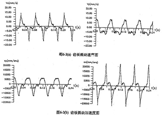 圖6-7是某相雙曲柄機構在輸入端具有0.03mm間隙時,齒板及軸承座的振動速度、振動加速度。圖中表明,速度、加速度都在兩個死點位置出現較大的沖擊值。
