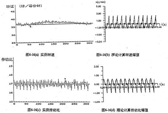 由于機構的變形及誤差等原因,將使輸出轉速及傳動比動變化,沖擊箱體、產生振動。圖6-16是對SHLEO15 型三環減速器實測及理論計算的轉速和傳動比隨時間變化的波動曲線。輸出轉速對比為
