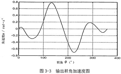 首先由圖3-2可以看到,若機(jī)構(gòu)結(jié)構(gòu)參數(shù)設(shè)計恰當(dāng),并且調(diào)整中間滑塊3偏移到合適的位置時,可在一定范圍內(nèi),產(chǎn)生一個反向的速度波適度抵消原速度波動。再由圖3-3可知,在未加入第二自由度時,加速度變化值不大,說明阻力矩和電機(jī)主動力矩不會受到大的影響,不致導(dǎo)致原機(jī)械系統(tǒng)的各項參數(shù)發(fā)生大的變化。