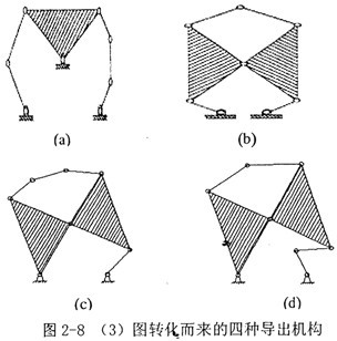 由(3)圖,取不同的構件為機架,經過特定化后,也可轉化為四種導出機構,如圖2-8。