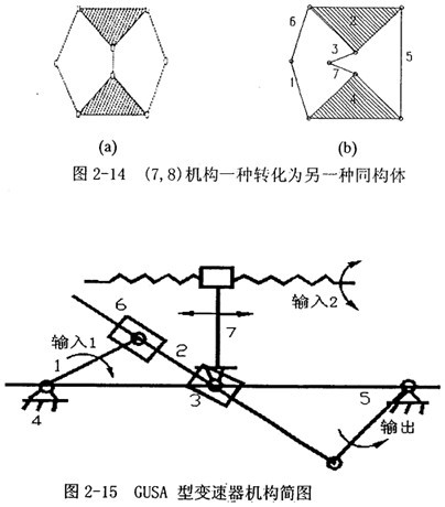方案三:在眾多已有機構類型篩選當中,發現機構式脈動無級變速器中的一種:三相并列連桿式(GUSA)脈動無級變速器采用的機構可以供鑒。這咱變速器設計原理為:采用三相并列結構,作為輸入機構的是相位差為120度的三曲拐曲軸,每個曲拐帶動一套Ⅲ級七桿機構,如圖所示是(7,8)圖譜中(1)的一種同構機構,圖2-14顯示了它的轉化和各桿件的標號,可以與圖2-15結構簡圖——對應。