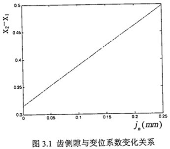 由3.2圖可以看出,當齒側隙jn由0變化至.25毫米時(查資料取較大最小側隙參考值),齒輪變位系數差X2-X1的變化量由近0.32變化到0.50,變化了約0.18。